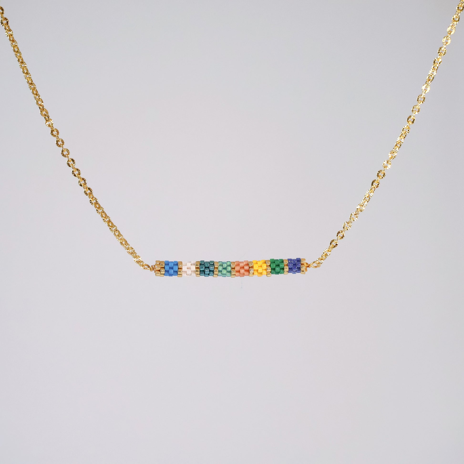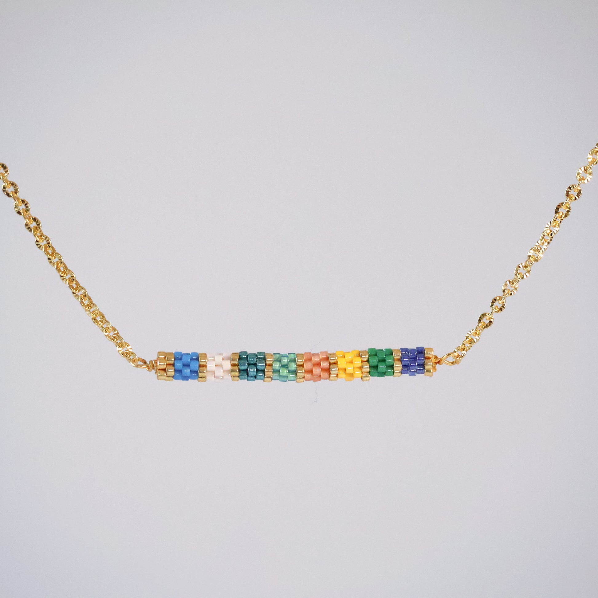This delicate design features a simple rope chain in gold-plated brass. The stunning bolster pendant was woven with blues, yellow, pink, green, white, turquoise and galvanized gold beads and attached to gold-plated brass findings to create a playful pop of color against your neck. A cute circle charm is attached to the closure, reminding you to circle back and reflect on the important things in life as you wear it.