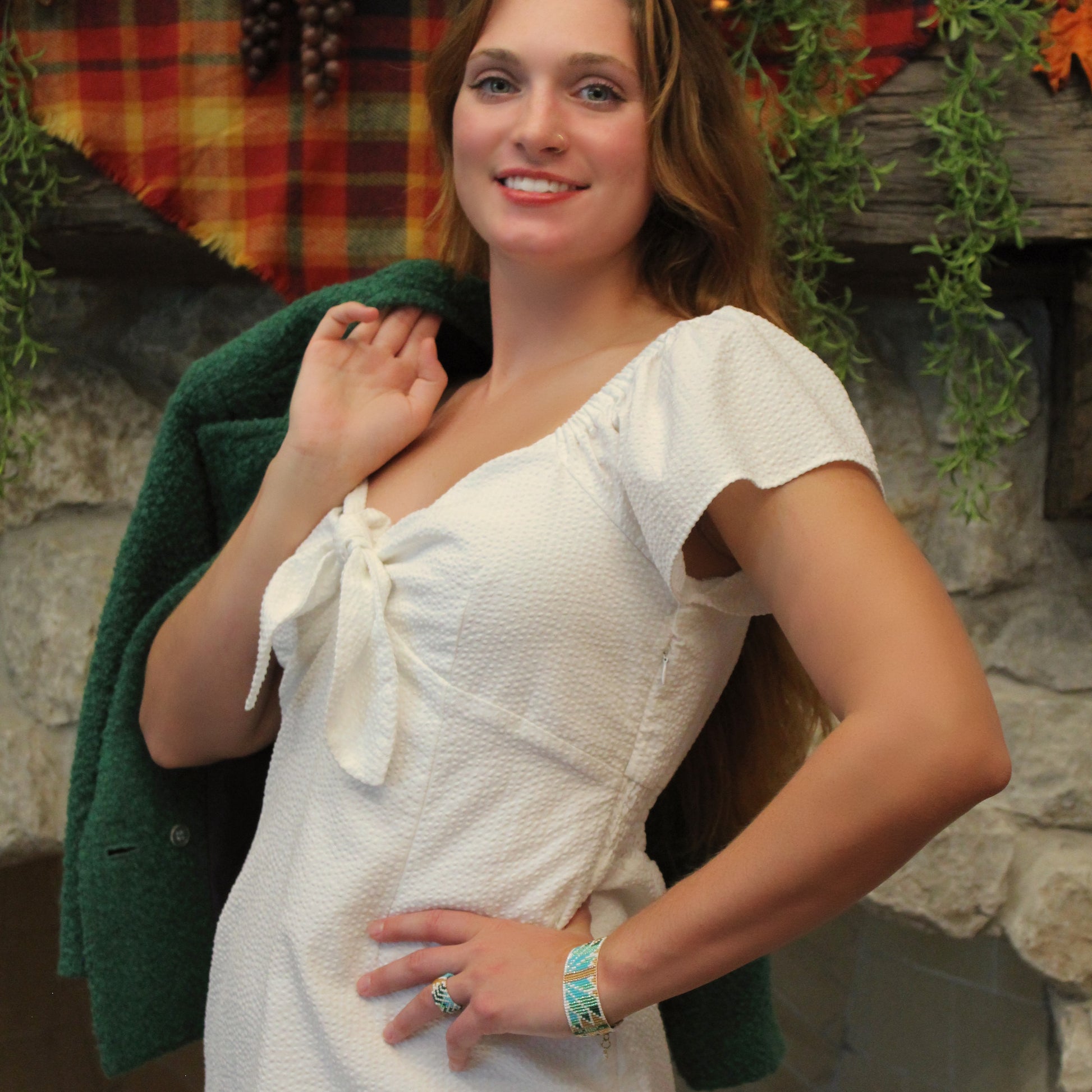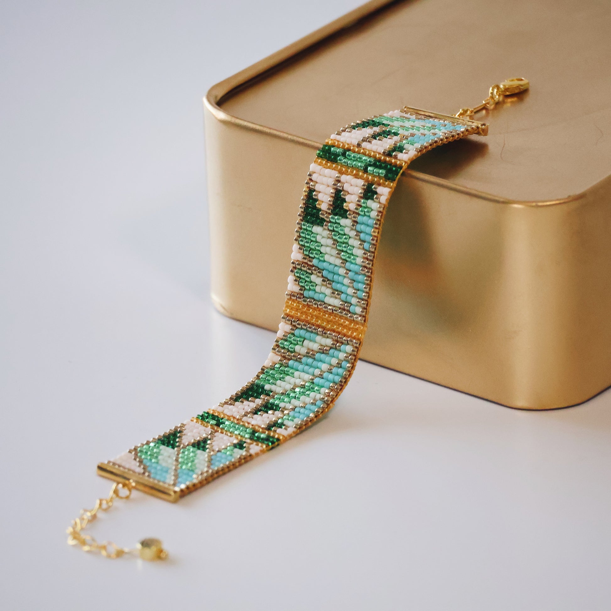 Featuring opaque turquoise and white beads along with translucent green and galvanized gold and green beads, this particular design is the perfect choice for those who want to channel some ecofriendly vibes. No matter the occasion, it will make your love of nature grow.