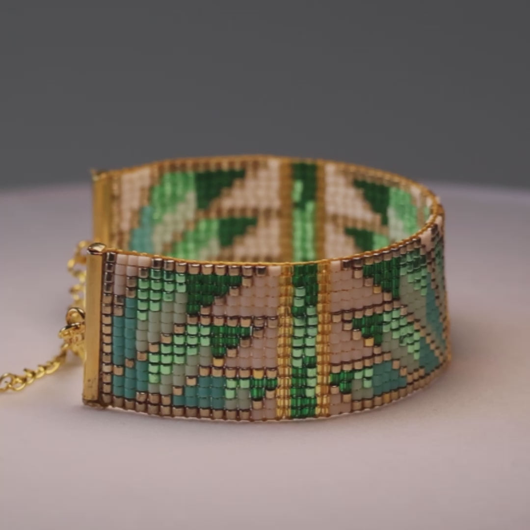 This exquisite design was skillfully handcrafted by Monica, using Japanese glass seed beads. Miyuki Delica glass beads are the finest in the world, with impeccable shape and design unmatched by any other. Our 18k gold and silver plating on the export quality brass findings add the perfect ending to this unique design. Each piece is one-of-a-kind, joyfully designed and handcrafted on a loom by Monica herself.