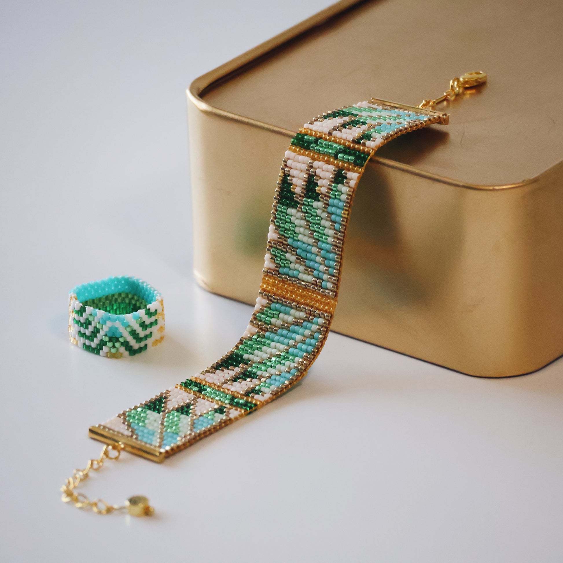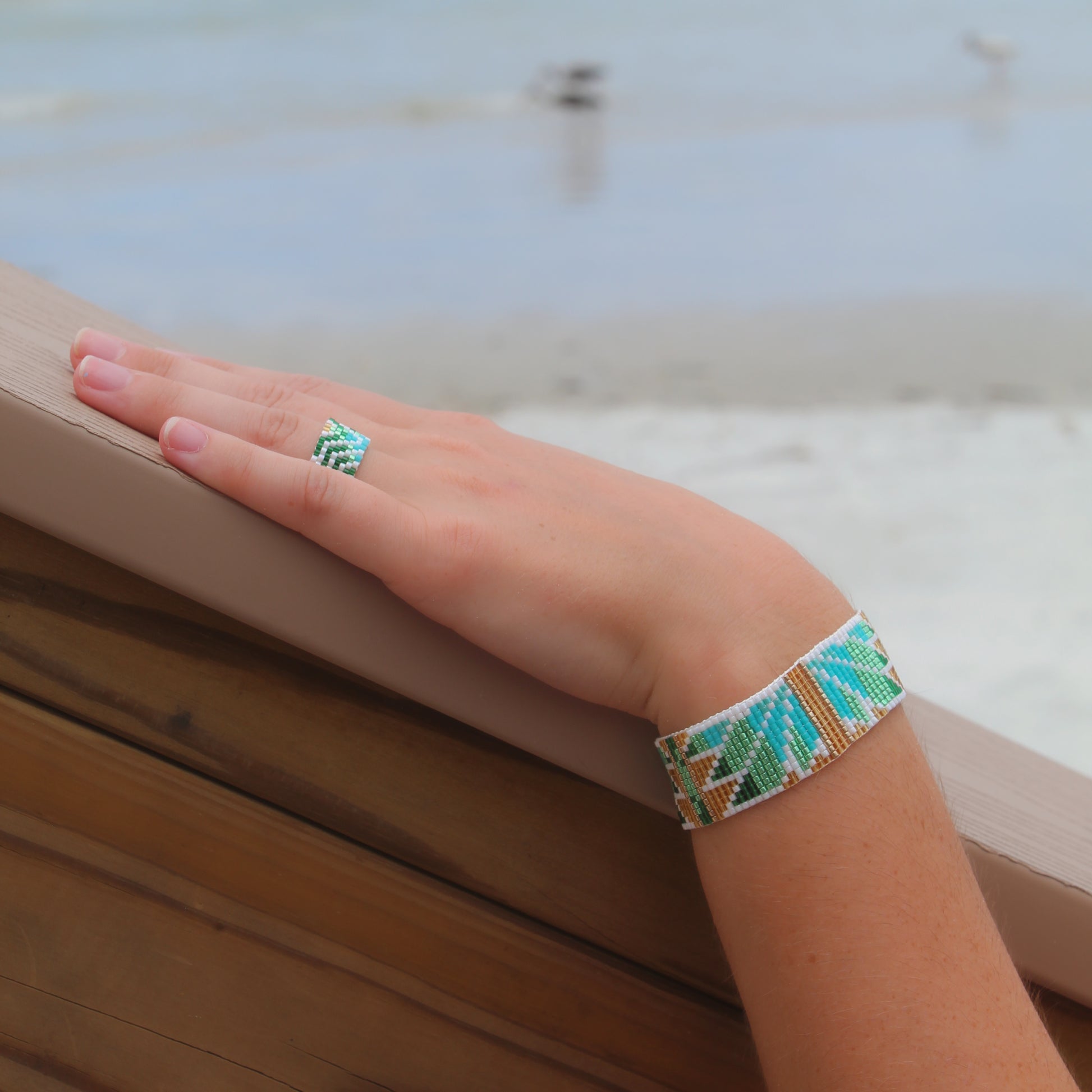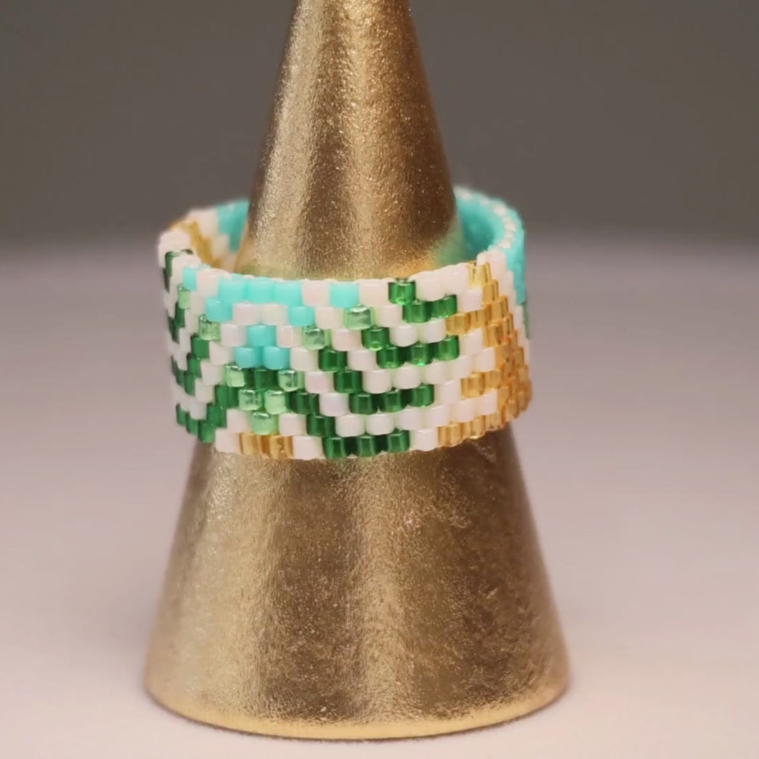 This particular design is handwoven with multi colors in our classic design of 8 rows. Featuring opaque turquoise and white beads along with translucent and galvanized green beads, this particular design is the perfect choice for those who want to channel some ecofriendly vibes. No matter the occasion, it will make your love of nature grow.