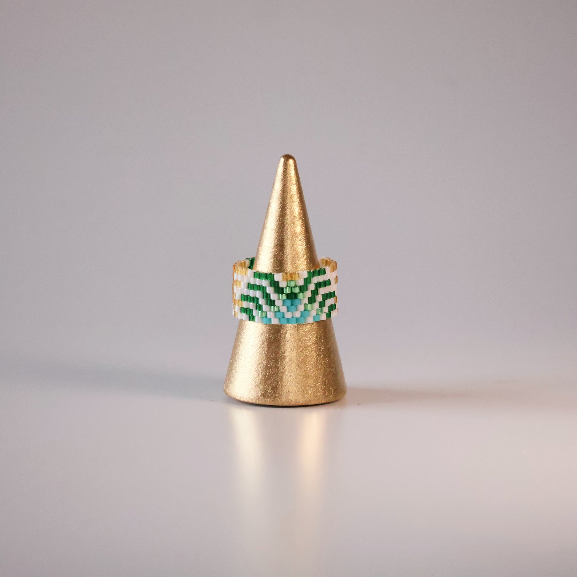 This particular design was inspired by Monica’s love of listening to the bamboo leaves rustle on her balcony in India. Here you have two rings in one. Put the bamboo leaves in the front for a stunning choice, or turn the ring around to have a more simple ring with bold colored stripes.