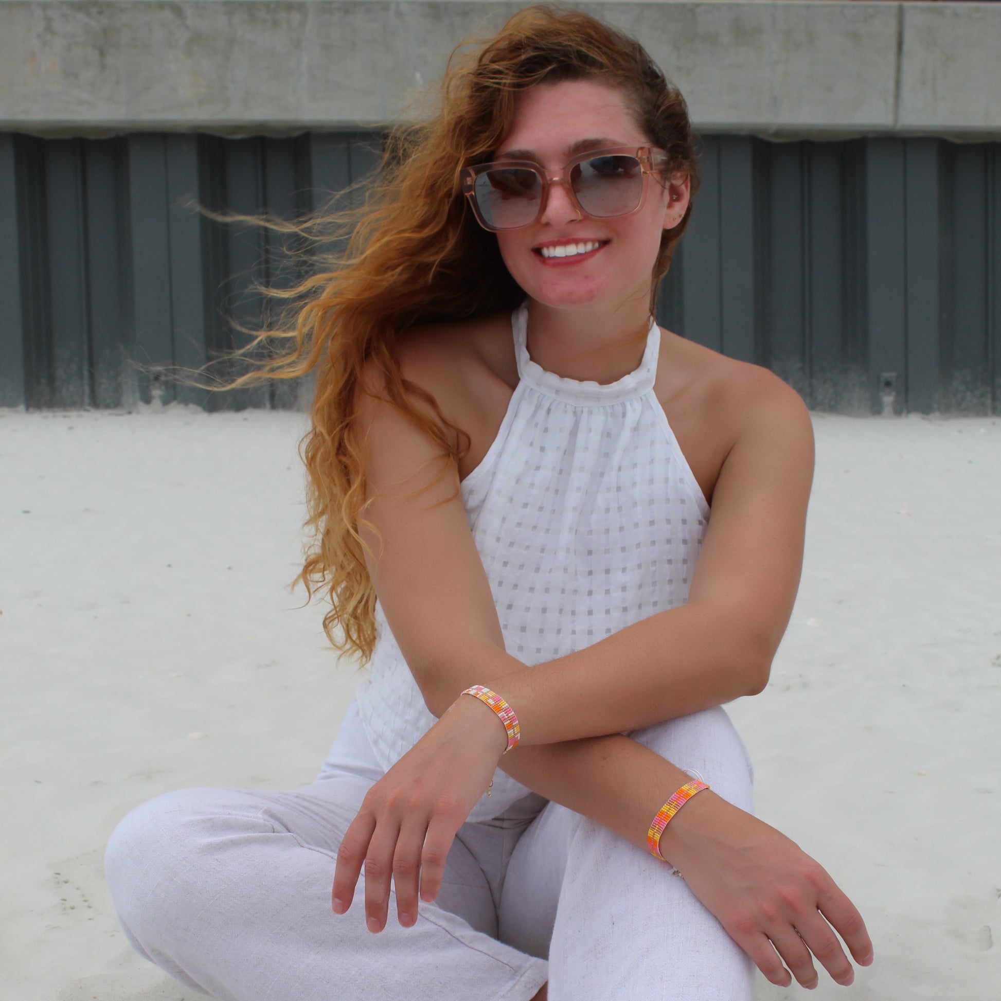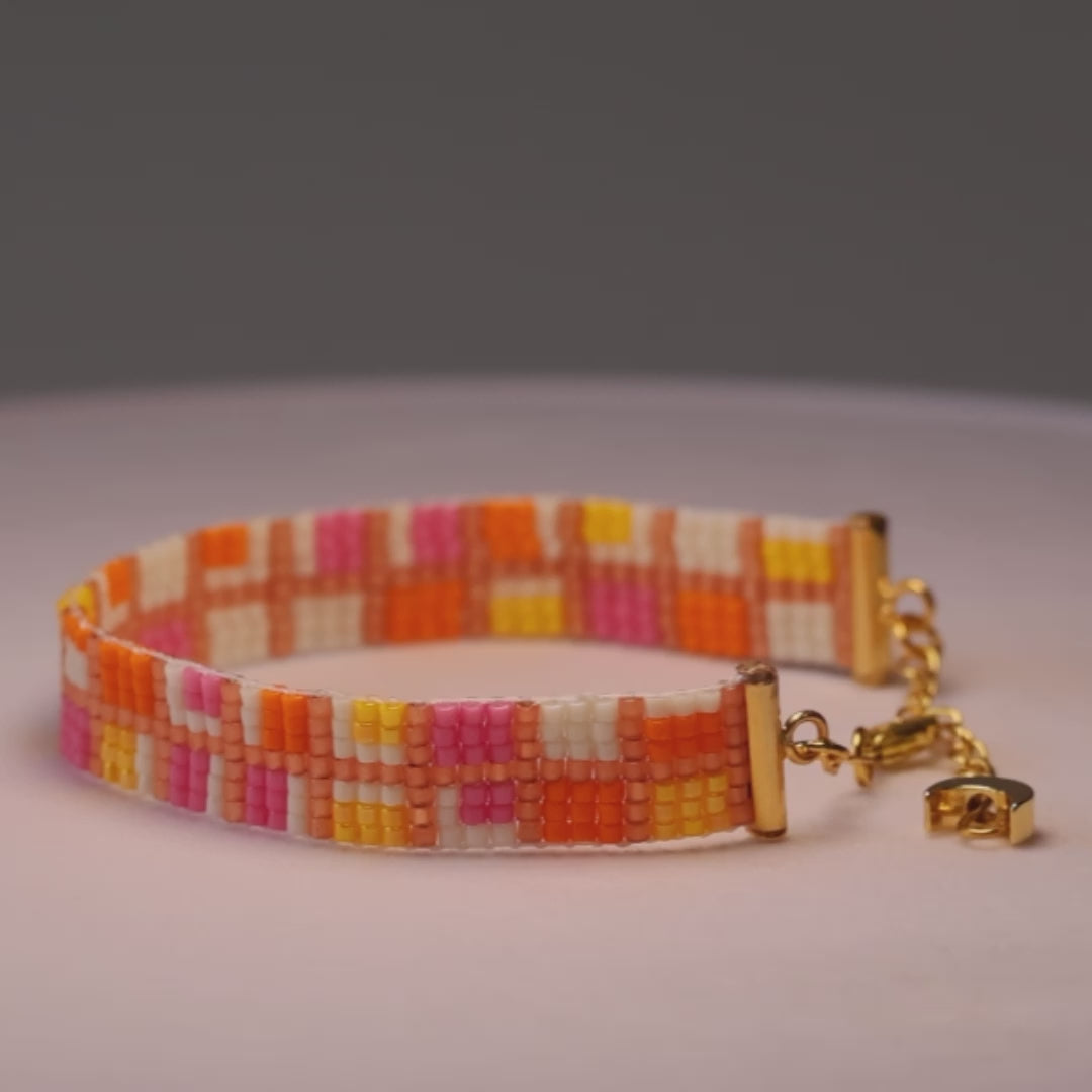 This exquisite design was skillfully handcrafted by Monica, using Japanese glass seed beads. Miyuki Delica glass beads are the finest in the world, with impeccable shape and design unmatched by any other. Our 18k gold and silver plating on the export quality brass findings add the perfect ending to this unique design. Each piece is one-of-a-kind, joyfully designed and handcrafted on a loom by Monica herself.