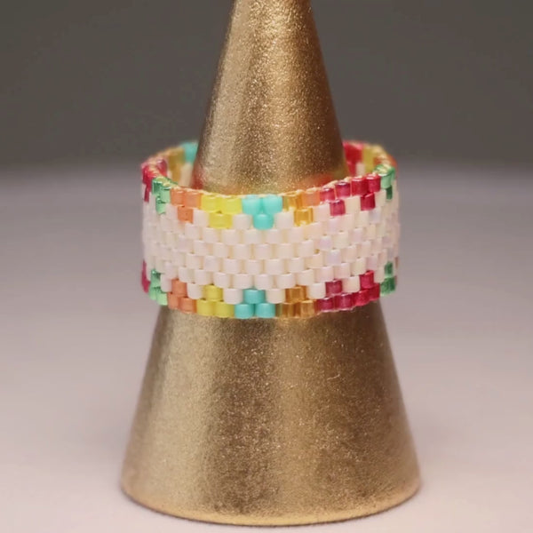 Featuring pink, turquoise, green and yellow translucent and opaque beads, along with the striking contrast of white, this particular design is the perfect choice for those who want to show their love of color and pattern. No matter the occasion, this will surely be what people are talking about.