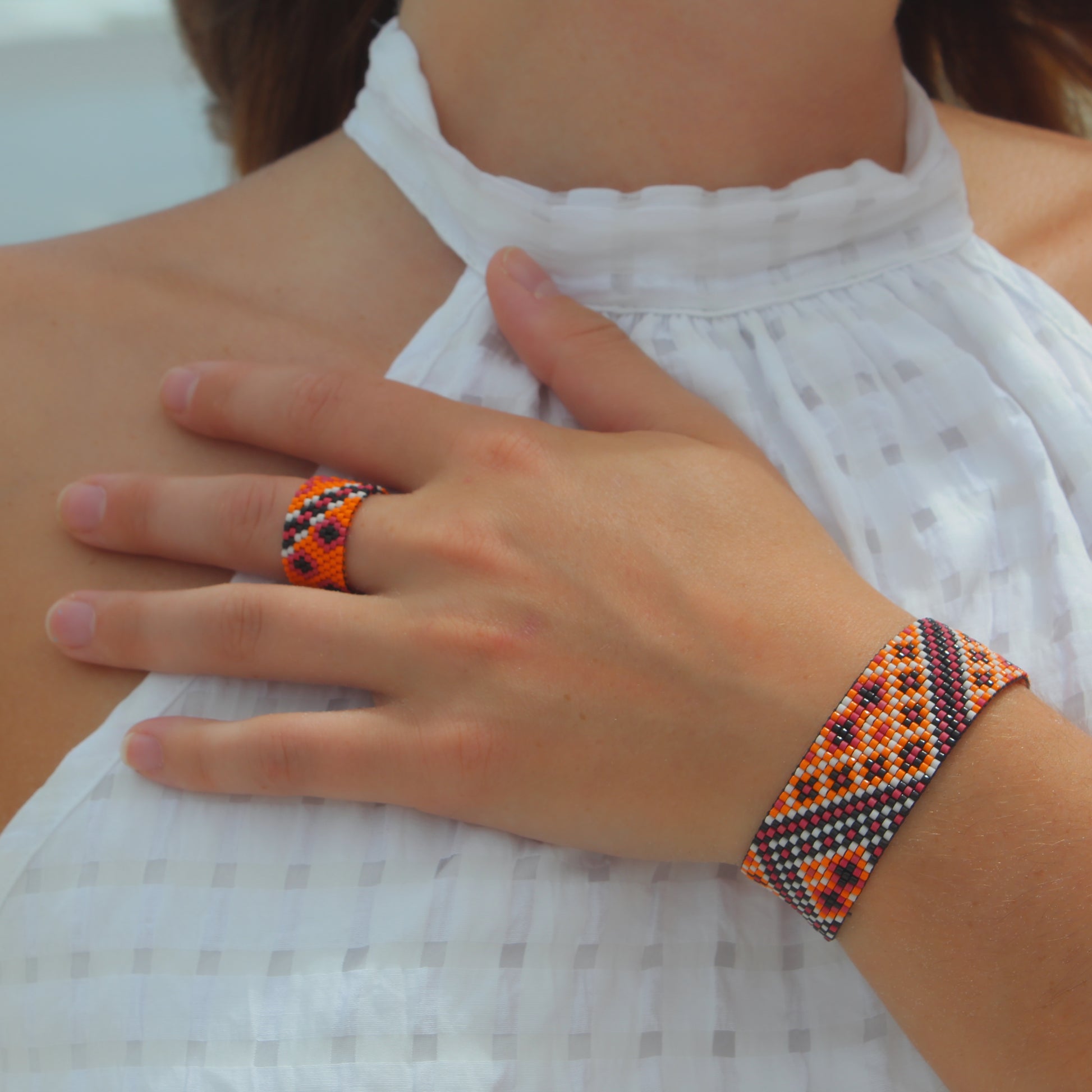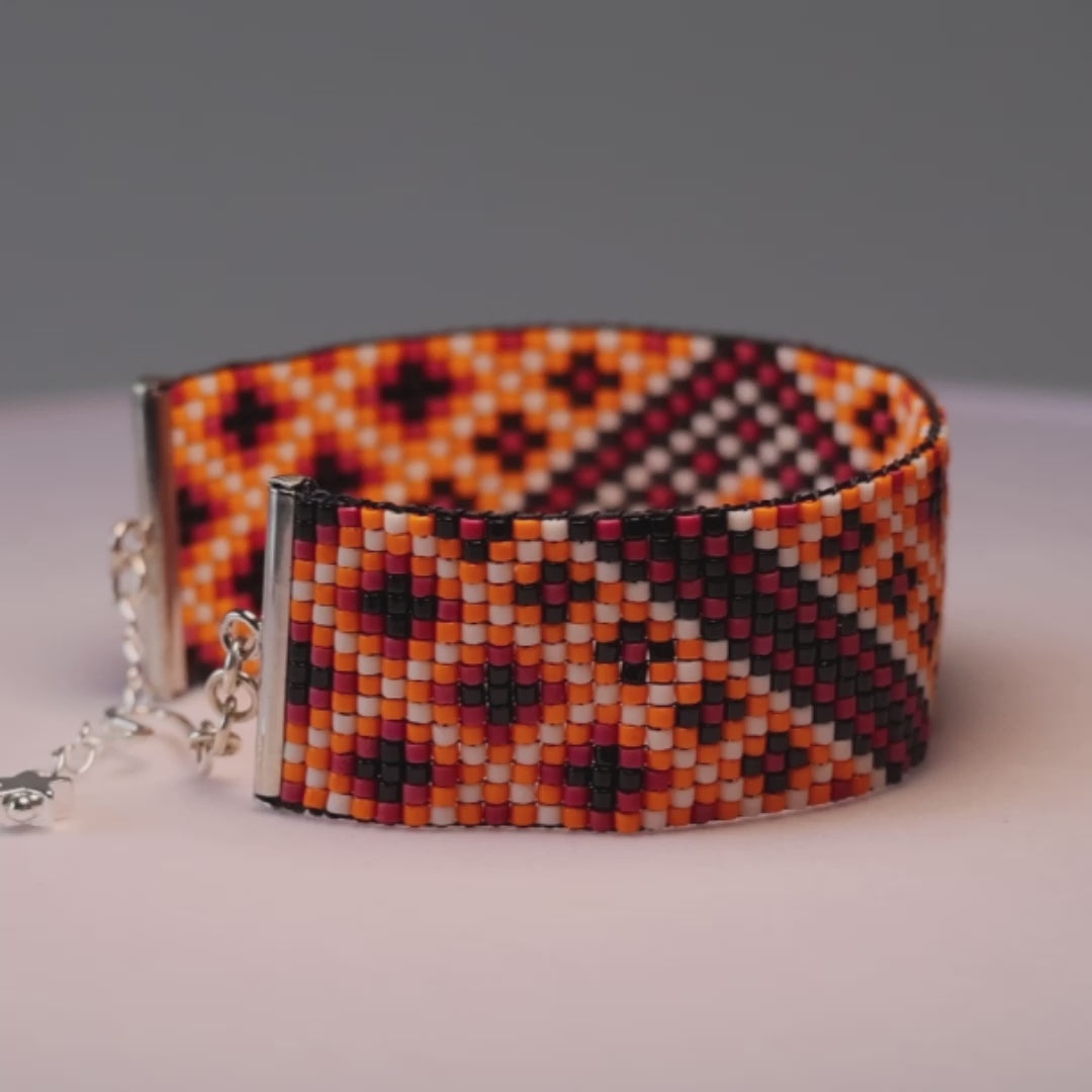 Featuring orange, pink, black and white beads, along with the striking contrast of the silver-plated brass fittings, this particular design is the perfect choice for those who want to add a burst of shine and happiness to their day.