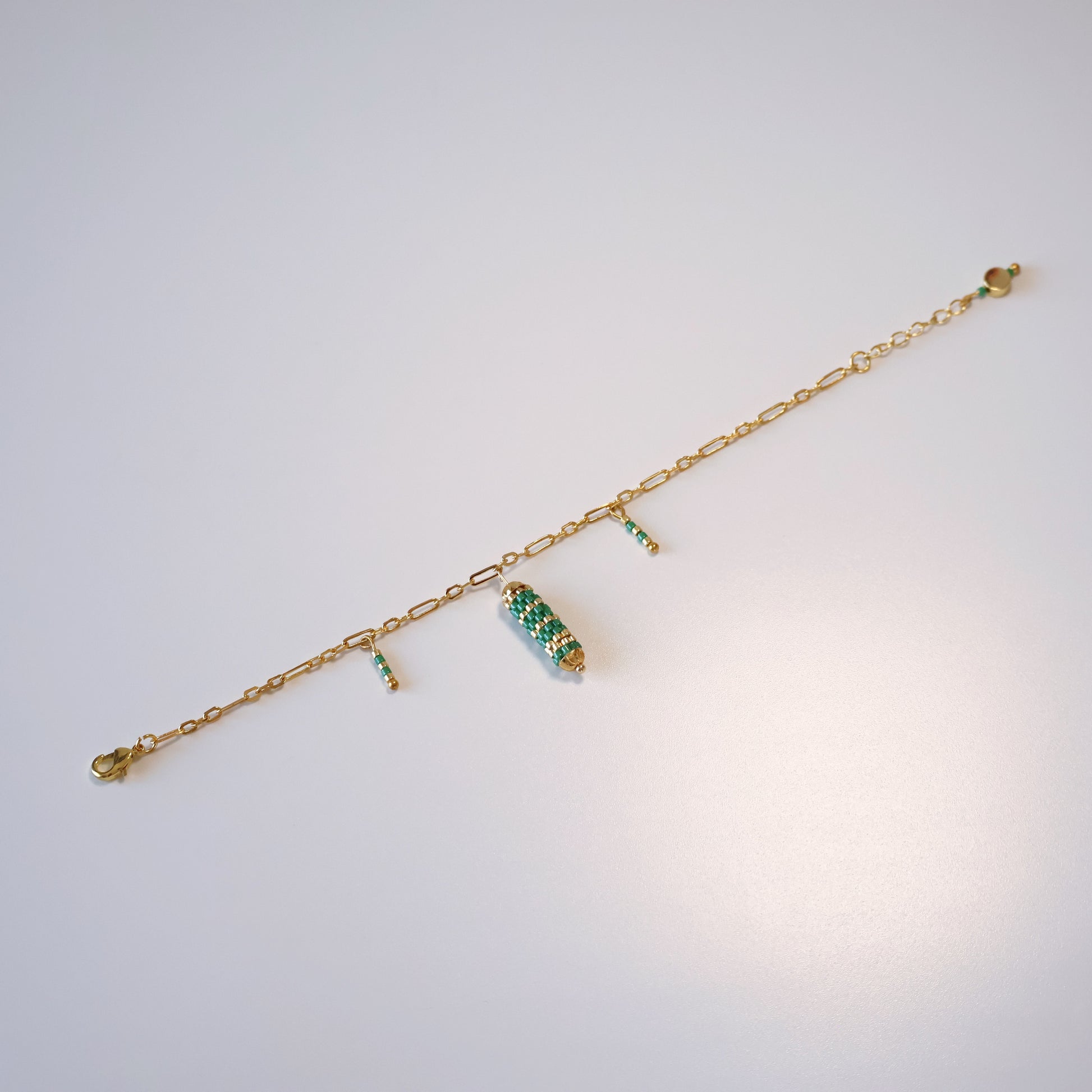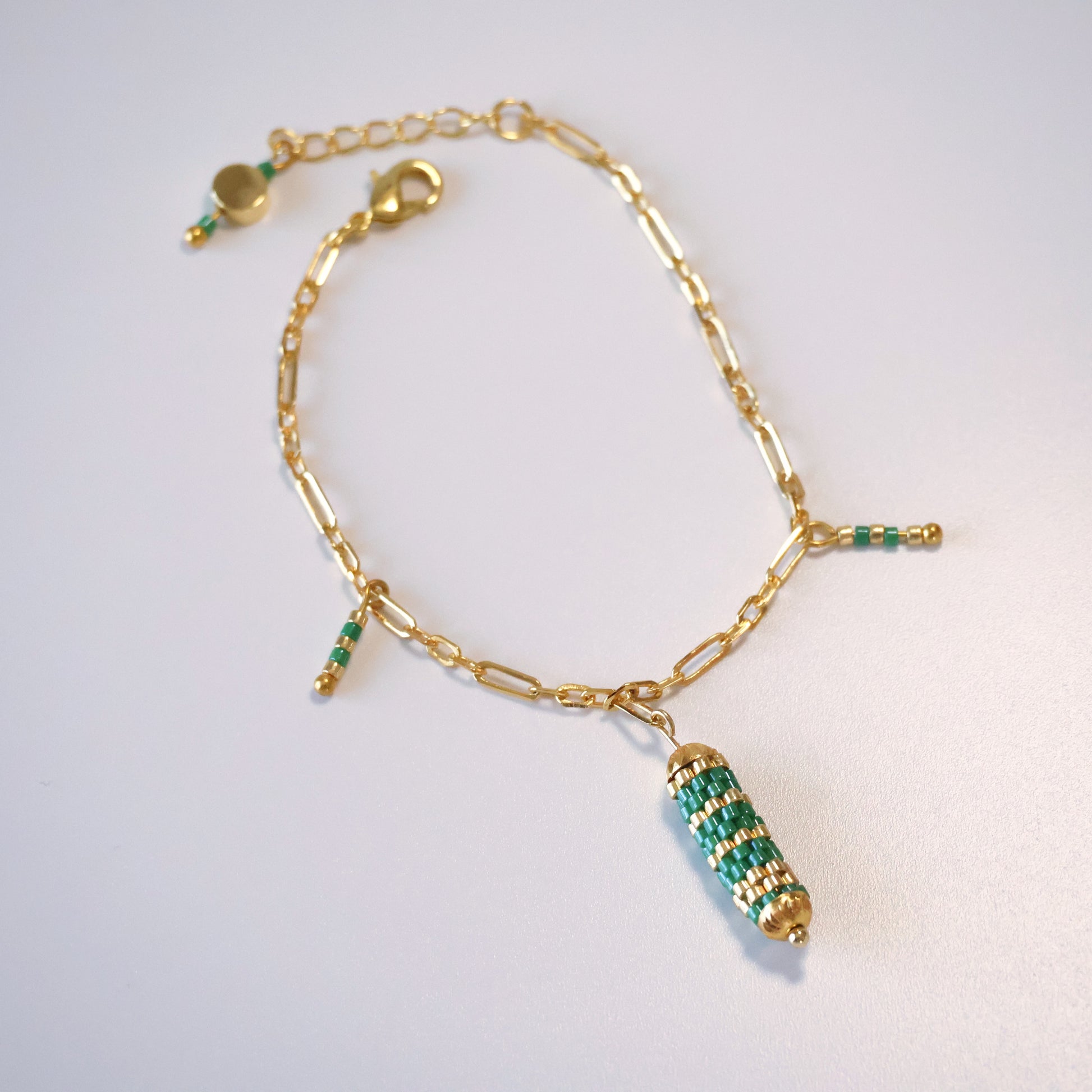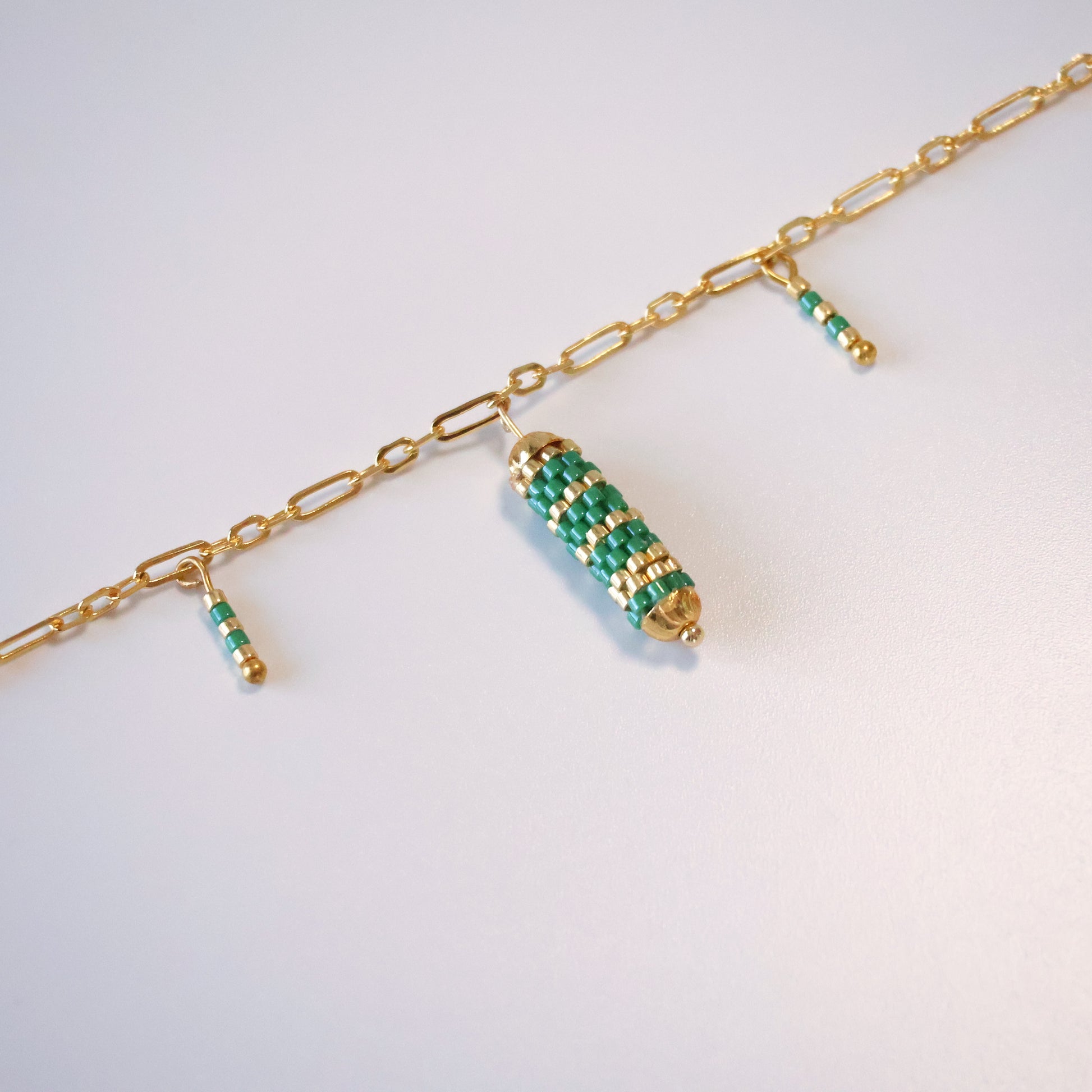 This delicate design features a paperclip chain in gold-plated brass. The stunning bolster attached to the middle was woven with green and galvanized bold beads and attached to gold-plated brass findings to create a playful pop of color against your wrist.