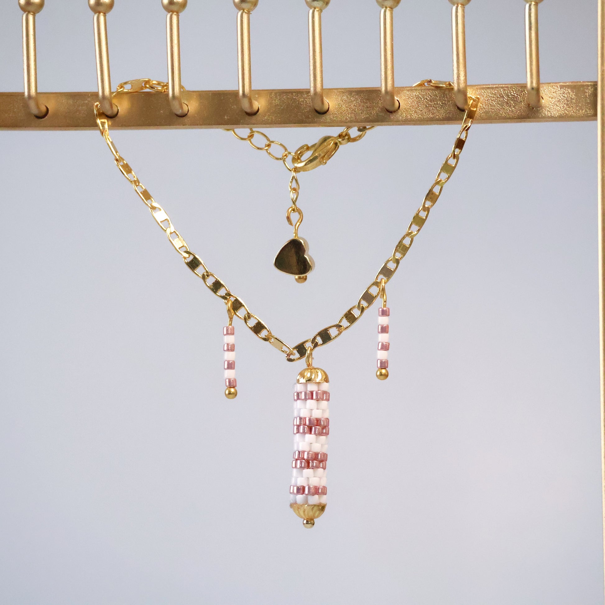 This delicate design features an artistic link chain in gold-plated brass. The stunning bolster attached to the middle was woven with pink and white beads and attached to gold-plated brass findings to create an elegant pop of color against your wrist. Two small charms are added to each side of the bolster to add more color and elegance to the bracelet. The set is then fixed to a lobster closure on one side and a safety chain on the other, which allows for ease and safety when wearing.