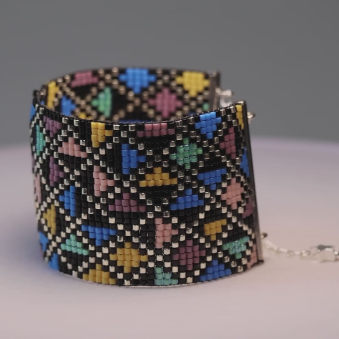 Featuring pink, purple, blue, green and yellow opaque and matte beads, along with the striking contrasts of silver and black. This particular design is the perfect choice for those who want to show their love of color and pattern. No matter the occasion, this will surely be what people are talking about.